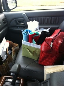 below is my “office”: diaper bag packed with iPad, etc. craft basket with hopeful future Christmas presents. bag of mail to be sorted.