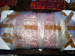 However, since I was out of town for most of the holidays things were a little crazy this week & included a good “lesson learned” moment in the studio. I am happy to say that my piece, “Impending” is included in the Texas Art 2013 show opening in Houston next week! Which means I needed to get it to the gallery this week. Unfortunately, I didn’t get back into town until this past weekend and wasn’t able to pick it up from the framers until Tues. So of course it was extremely painful when the shipping costs were calculated, & UPS said because of the size that even with paying they couldn’t guarantee that it would get there by Friday. Another shipper could, but it would cost me $300 each way, yikes!! So let’s just say I am throwing the kids in the car early Saturday morning to drive 3hrs each way to hand deliver the piece. It could be worse, at least I can drive there. Here is my piece all wrapped up- more than able to make the drive unharmed 🙂