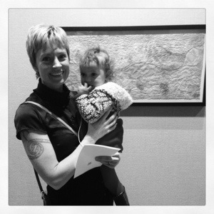 There is the toddler and me in front of my piece. Not my favorite picture, but the only one where the little was still for 2 seconds. She wanted to just run wild the whole time, so here is what my husband did over and over while I had a chance to look at the artwork and mingle a bit 🙂